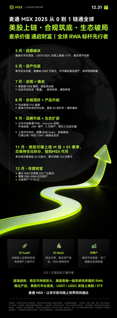 站在 2025 年底回望,麦通 MSX 已完成从 “创新想法” 到 “稳定运转的全球 RWA 基础设施” 的跨越。 222.49 亿美元的累计 RWA 交易额、200 多只支持的 RWA 代币资产、17.19 万注册用户,这些数据是对其全年深耕的阶段性肯定。进入 2026 年,其发展目标更为清晰:从 “站稳脚跟” 向 “参与定义标准” 迈进,在更广阔的舞台上创造价值。
